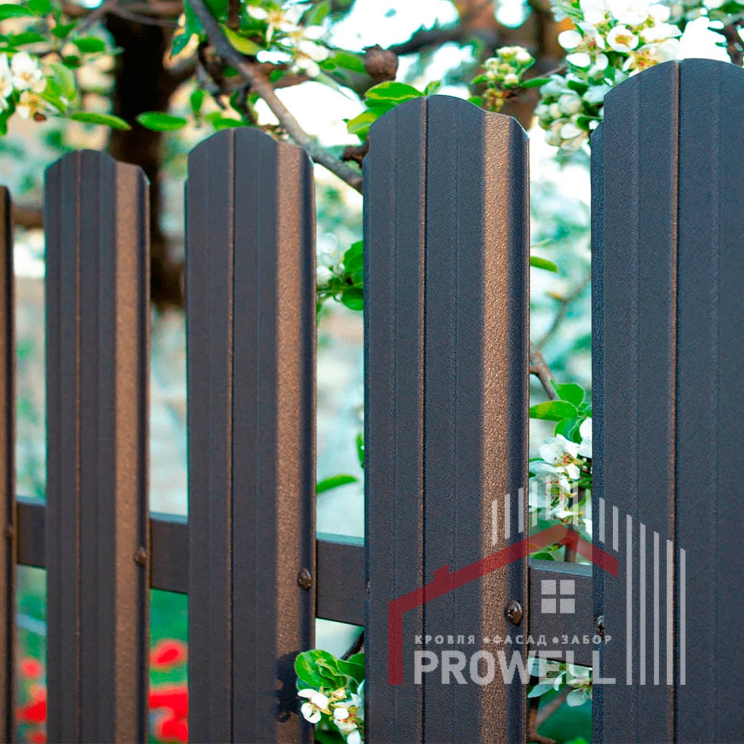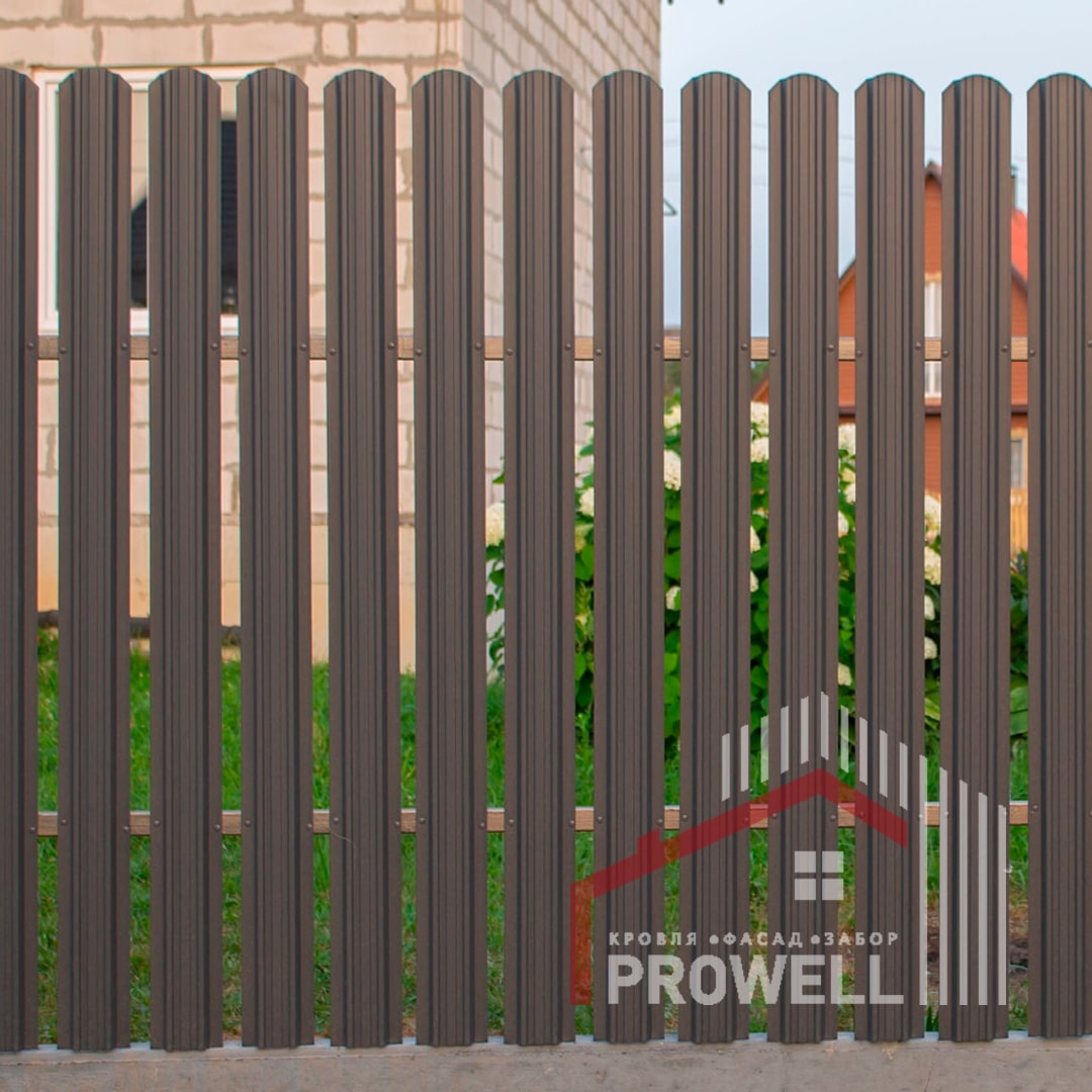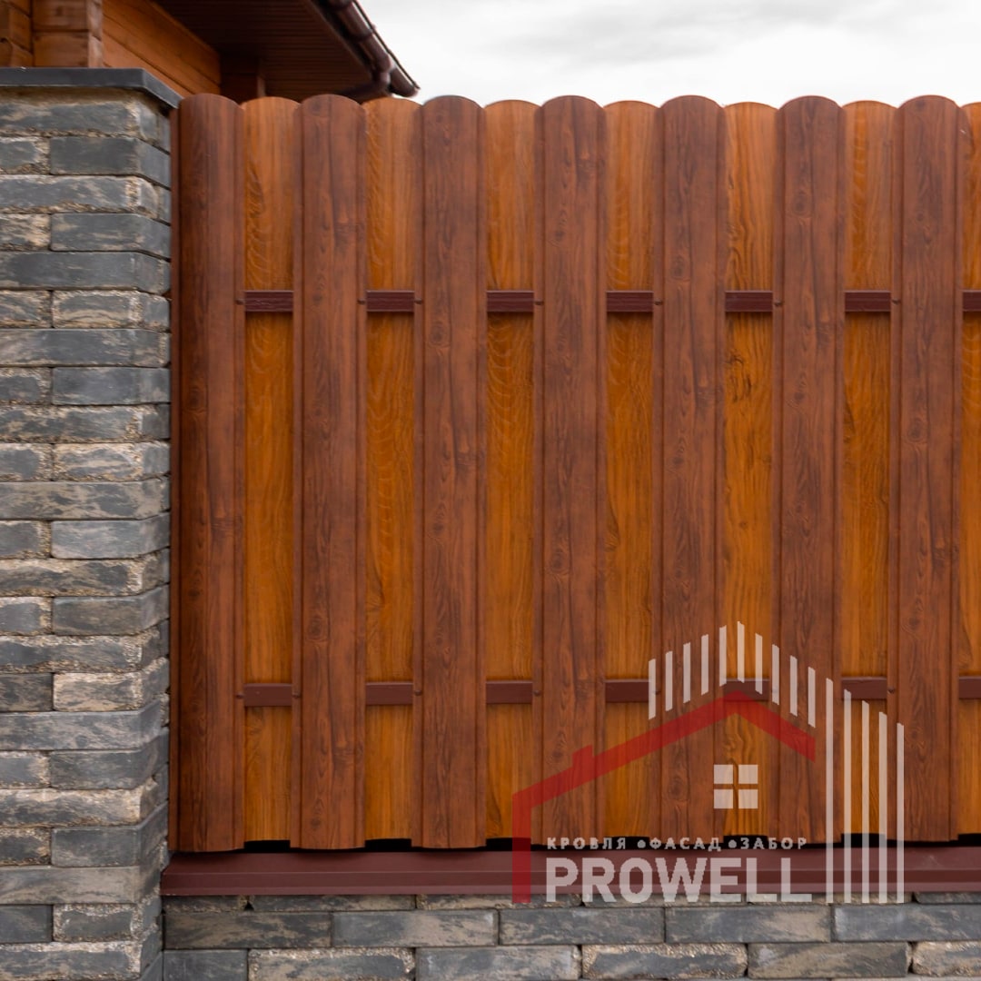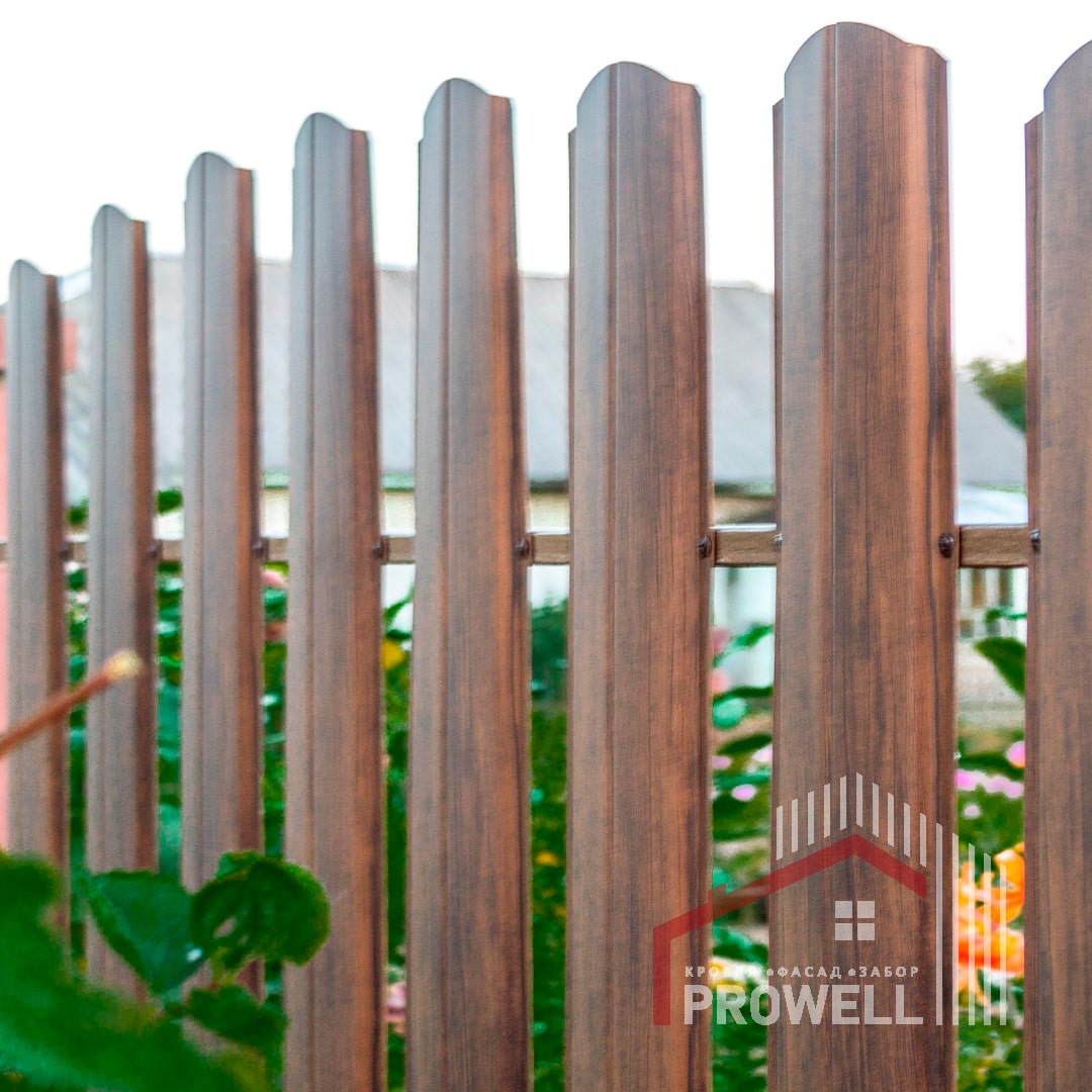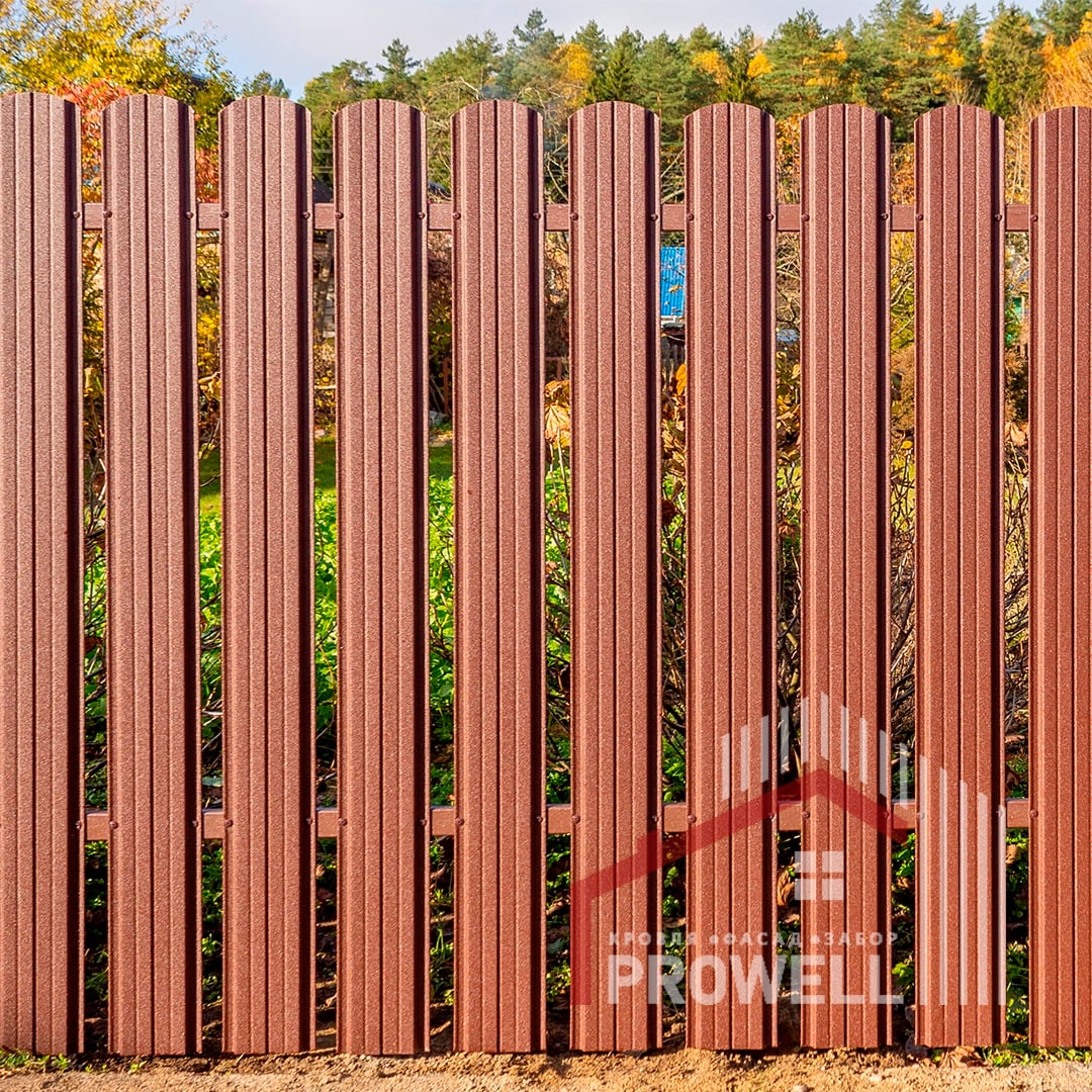 Модель этого металлоштакетника подходит тем покупателям, которые хотят забор, произведенный из металлического штакетника, но чтобы он выглядел, как доска.